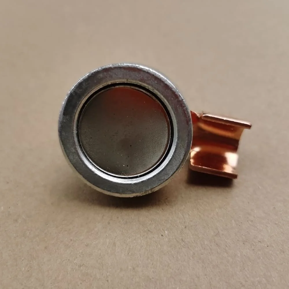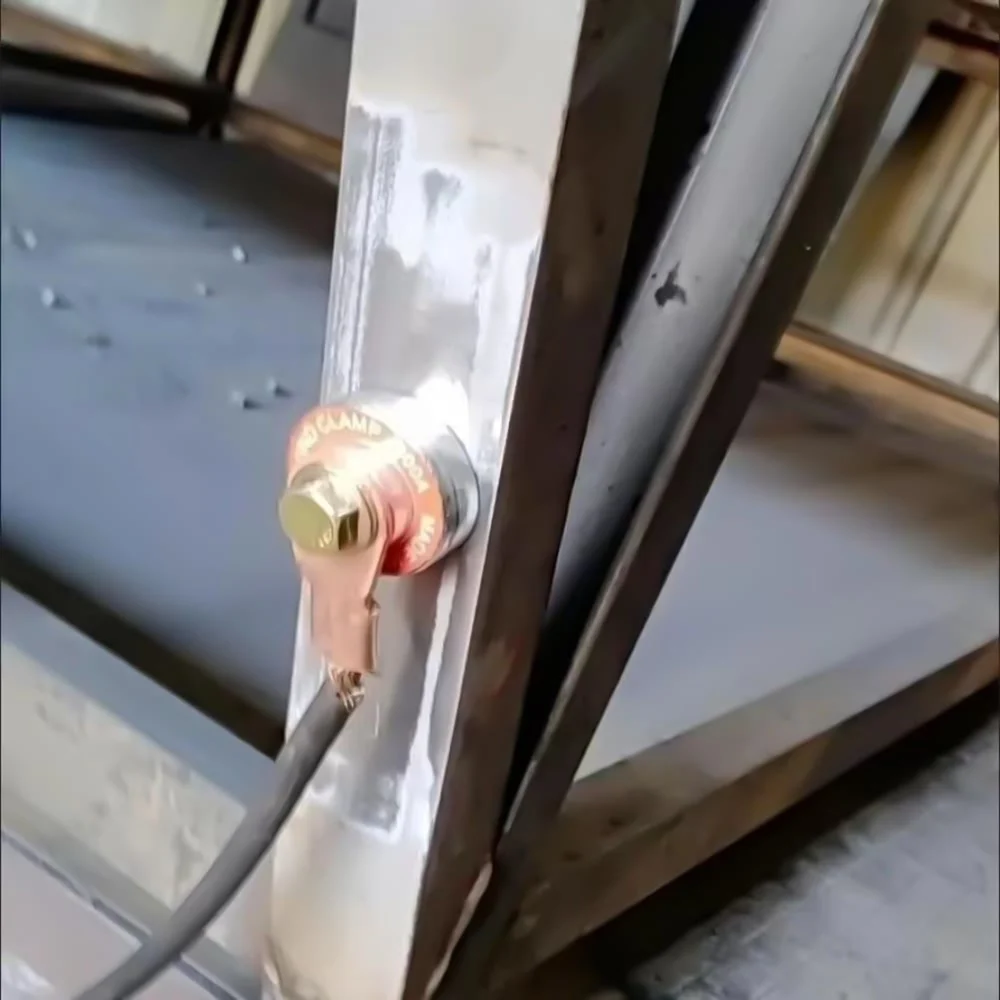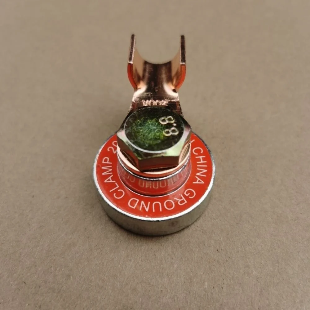 • If the cross-sectional area of the object is smaller than the diameter of the grounding clamp, it is recommended to place a small flat iron plate underneath the clamp before grounding. The magnet is used to connect to the object and is not conductive. The conductivity is achieved through the outer circumference of the magnet, so the entire outer circumference must be in contact with the iron surface.
