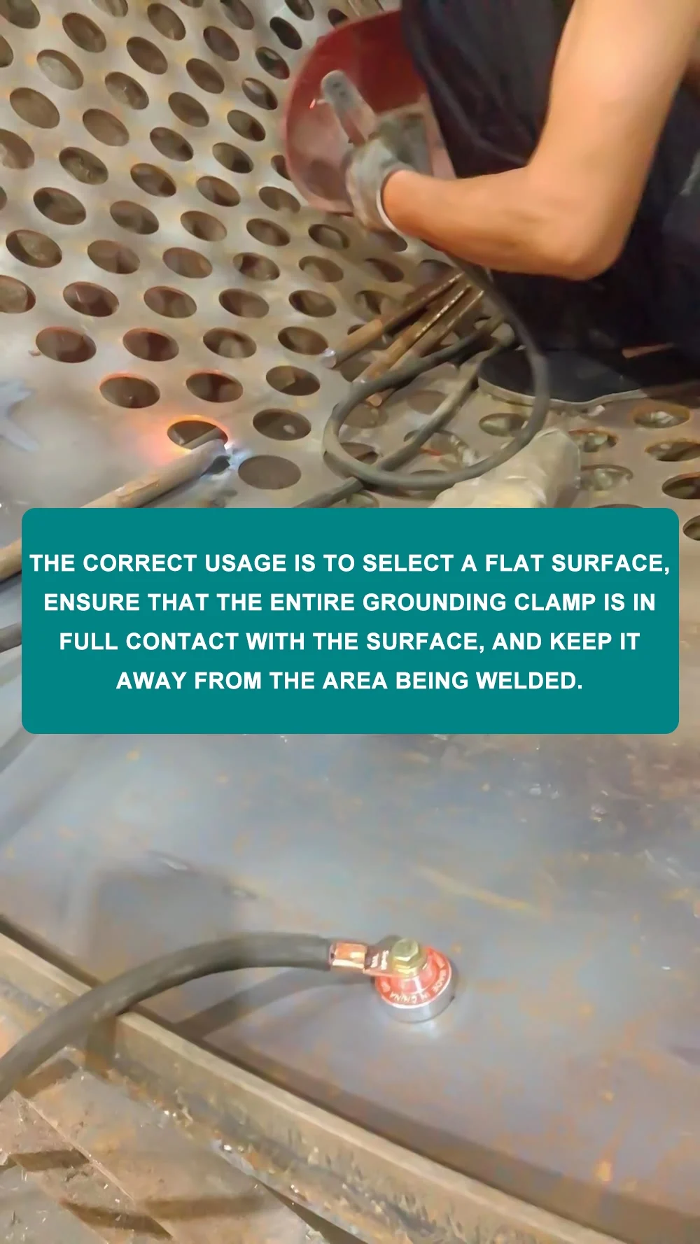 • Choose a flat surface for grounding (the grounding area should be at least 80 cm away from the welding area. Do not ground on small contact areas such as steel bars or wires. The entire grounding clamp must be in full contact with the surface, and it should be kept away from the welding area. Clean the surface of the magnet to remove any rust or iron filings that may have accumulated.)