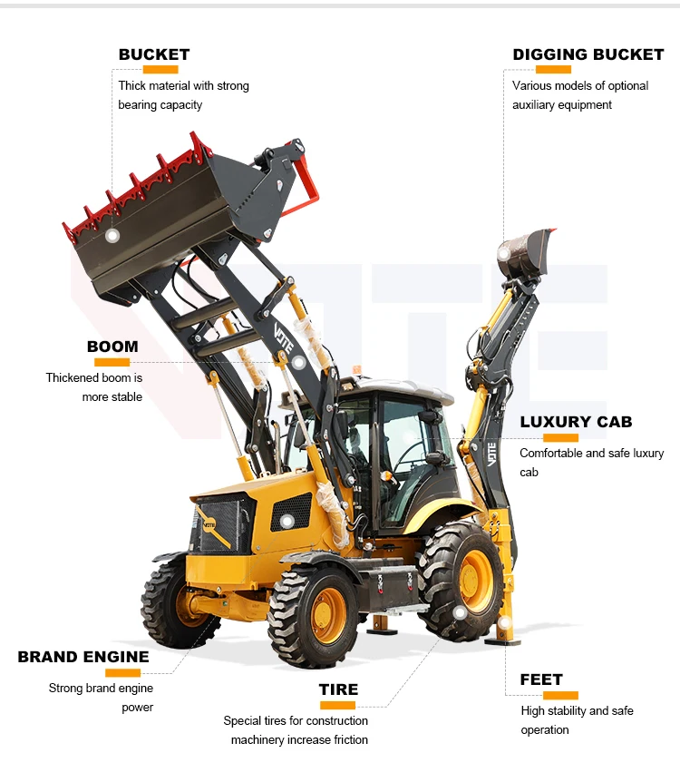 Advantages of Backhoe loader: support multi-function operation, fast attachment of accessories, excavation, crushing, trench cleaning, drilling and bulldozing;