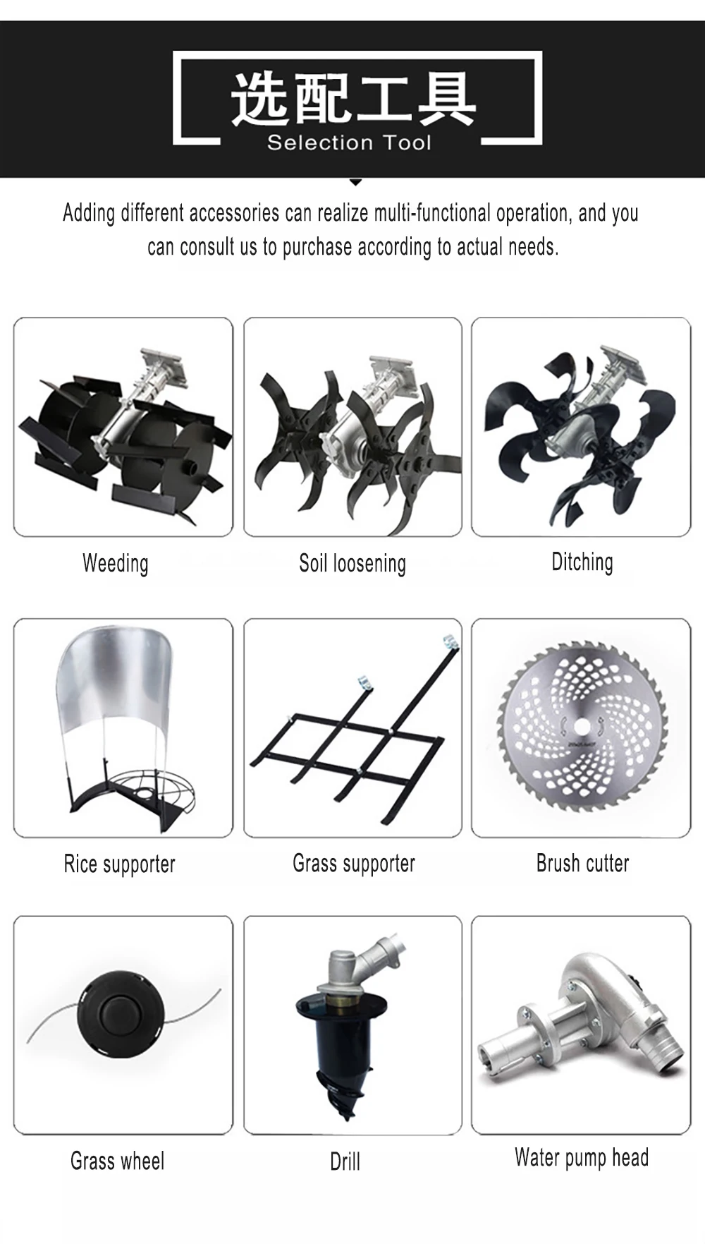 3. Compared with the rotary tiller, the operation of this machine is simpler, more flexible, lighter and more practical. It is easy to use this machine to enter the area that the tiller cannot enter, and the weeding is cleaner and more fuel-efficient. The labor force of housewives can be easily used; the work efficiency is about 4-5 times that of labor;