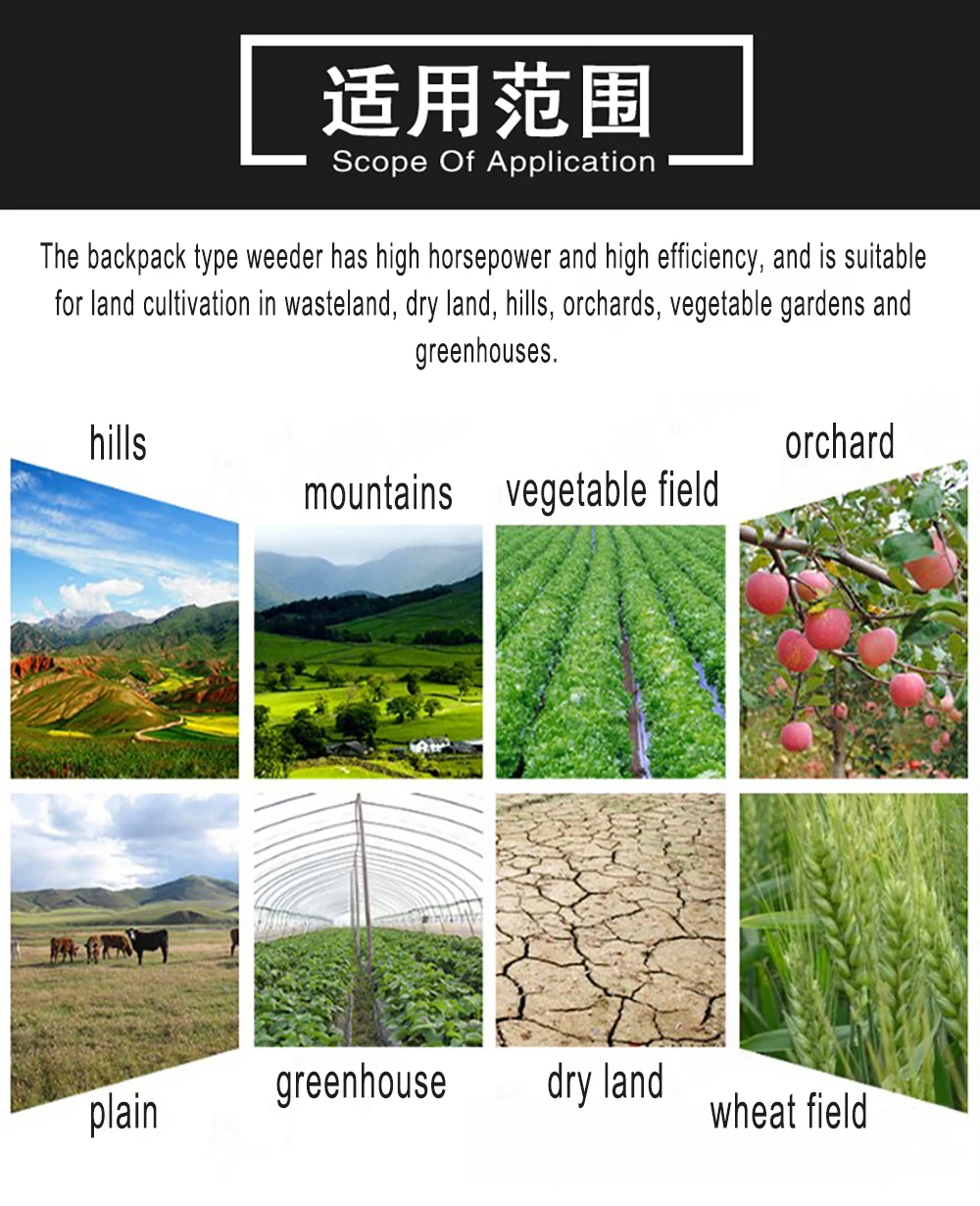 It is widely used in field farming, plastic greenhouses, tobacco, nursery, orchard, tea garden management and other weeding and planting operations. It has the characteristics of light weight, small size, simple structure, convenient operation, easy maintenance, low fuel consumption and high production efficiency.