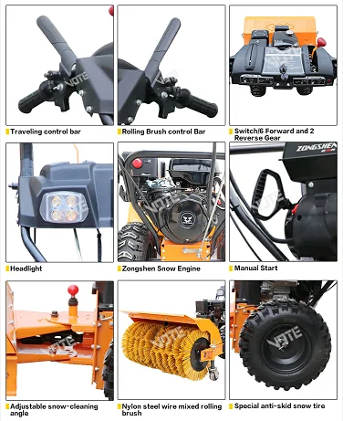 2.This small snow power sweeper configurates innovative, high anti-resistant, spiral sheave scraper, keeping the ground from scraping meanwhile guanranteeing snow removal. Special designed grooved tryes ensure good non-slip performance. Strong suction power make it easily to remove hard snow drifts.