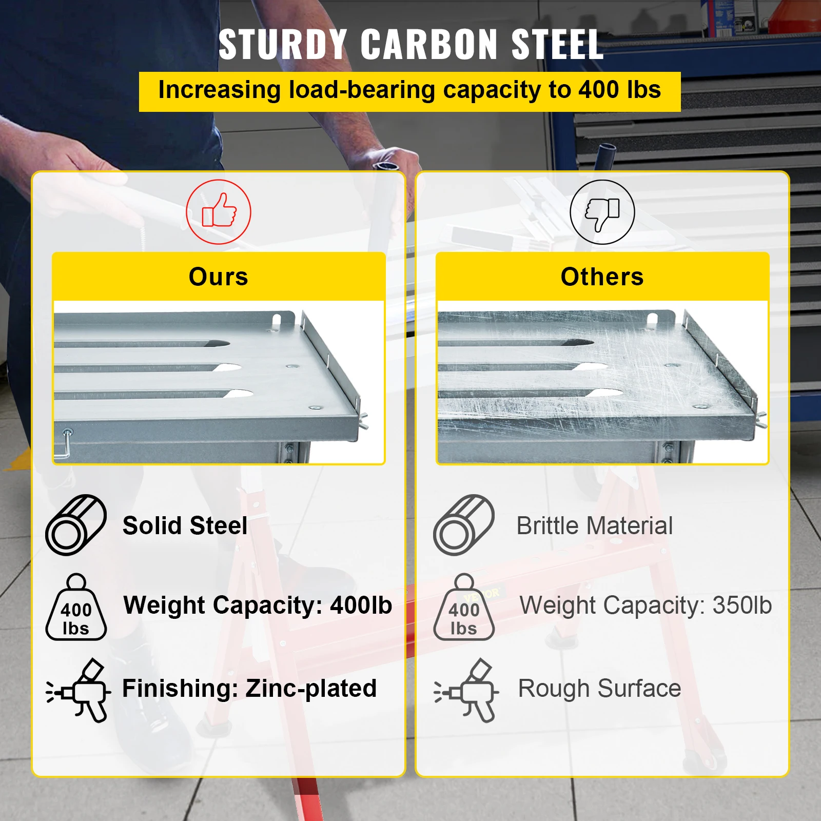 400 lbs Load Capacity: A carbon steel frame has forged this solid but lightweight welding table and has increased the load-bearing capacity to 400 lbs. Heavy-duty zinc plated surface makes it resistant to rust and ensures a long service time.