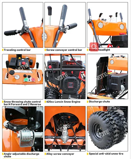 2.This small snow power sweeper configurates innovative, high anti-resistant, spiral sheave scraper, keeping the ground from scraping meanwhile guanranteeing snow removal. Special designed grooved tryes ensure good non-slip performance. Strong suction power make it easily to remove hard snow drifts.